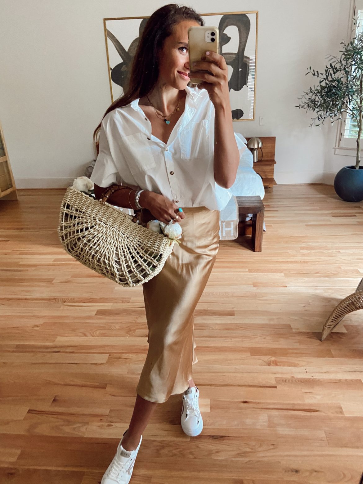 Slip Skirt and black slip skirt // Safari Top // Loci Sneakers and similar / Straw Bag // Art // Planter // Olive tree