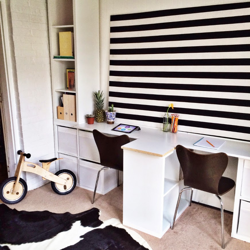 10. Sofia Black and White Stripe Fabric I've covered headboards, pillows and here for a pin board in this fabric and it has yet to fail me. If you're wondering how we made this board: We purchased Homasote (fiber board) from Menards, covered it in fabric and stapled and sprayed it with fabric adhesive Before... in process