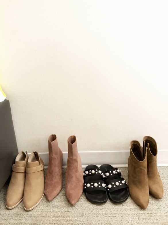 shoe line up left to right booties // boots // sandals // boots // outfit 1 jeans only $51! // shearling coat // long sleeve tunic // booties outfit 2 coat…