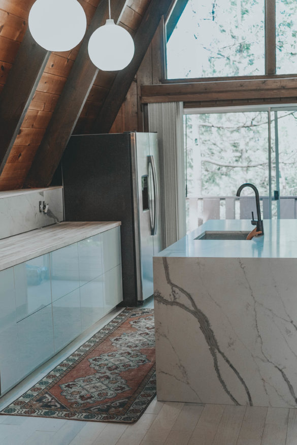 Before/After We announced over the weekend that our A Frame cabin kitchen is ALMOST finished! The island waterfall countertop was installed in addition to the matching surface backsplash. There…