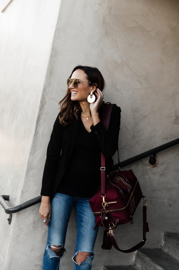black tee and similar// jeans // duffel/backpack/gym bag // two penny blue and similar blazer // earrings // sunglasses // boots // bella band // The Self Tanner I Use Its finally Friday…