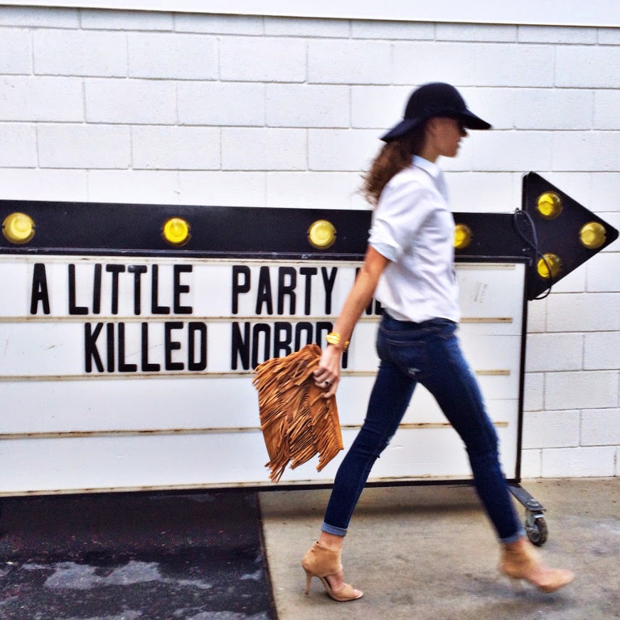 If you’re looking for that one-of-a-kind vintage Chanel, look no further than Rice and Beans Vintage. What I love about this Chanel backpack, besides the fact that it is Chanel and gorgeous, is that it is hand’s free. I can carry my essentials and still have hands available for my little ones who invariably come with all those spills and hugs. A great thing to keep in mind about feature pieces … always pair your feature piece–for me it’s my jacket with all its intricate lace–with a subdued color like black so as to keep it chic and not too loud. For instance, if this jacket was white, I would wear white jeans. It’s all about balance. And in order to let the jacket and Chanel shine, I chose my go-to nude sandals because that’s all I really needed for date night. Well, maybe a margarita or two but I wouldn’t limit that to just date night. Follow Rice and Beans Vintage on Instagram to see vintage Chanel as it arrives!