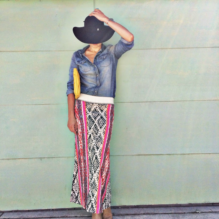 Fairisle Skirt // Similar // Denim Shirt // Booties // Torchlight Jewelry // Floppy Hat