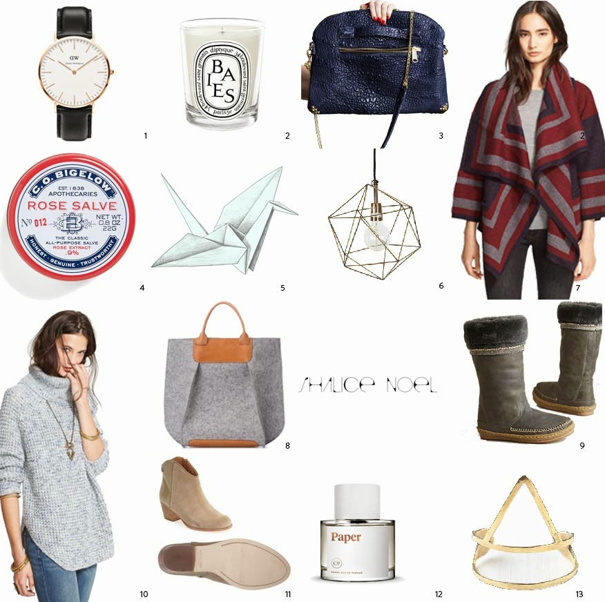 1. Daniel Wellington Watch I can’t resist a good men’s watch. Use code “shalicenoel” on their website www.danielwellington.com to receive 15% off your purchase till November 30, 2014 2. Dipytique Candle Virtually an icon in the candle world. This one makes a great stocking stuffer. 3. Kimder GEE bag All her gorgeous bags are made to order. To purchase contact: info@kimder.ca 4. Rose Salve to save your lips from winter 5. Origami anyone? 6. Geo Pendant So cool and virtually no sticker shock. 7. Burberry Brit blanket wrap its graphically pleasing and luxe. Get your dupe here 8. Graf+ Lantz Gray Frankie Bag Equally durable and gorgeous. Check out their color block duffel bag 9. Laidback London Kili Black Silver love this shorter version too. More over Uggs, these boots are handmade and pure luxury. 10. Free People Sweater Cable knits and turtleneck sweaters are my new obsession. Buy in every color. 11. Koolaburra Notela boot I also love the fringe Dallas boot 12. Commodity Goods The hubs has them to thank for upping my perfume game without the headache. Whether you choose paper, moss or cloth, you will smell amazing. 13. Free People Arrow Cuff Simple gold goodness that won’t compete with your look.